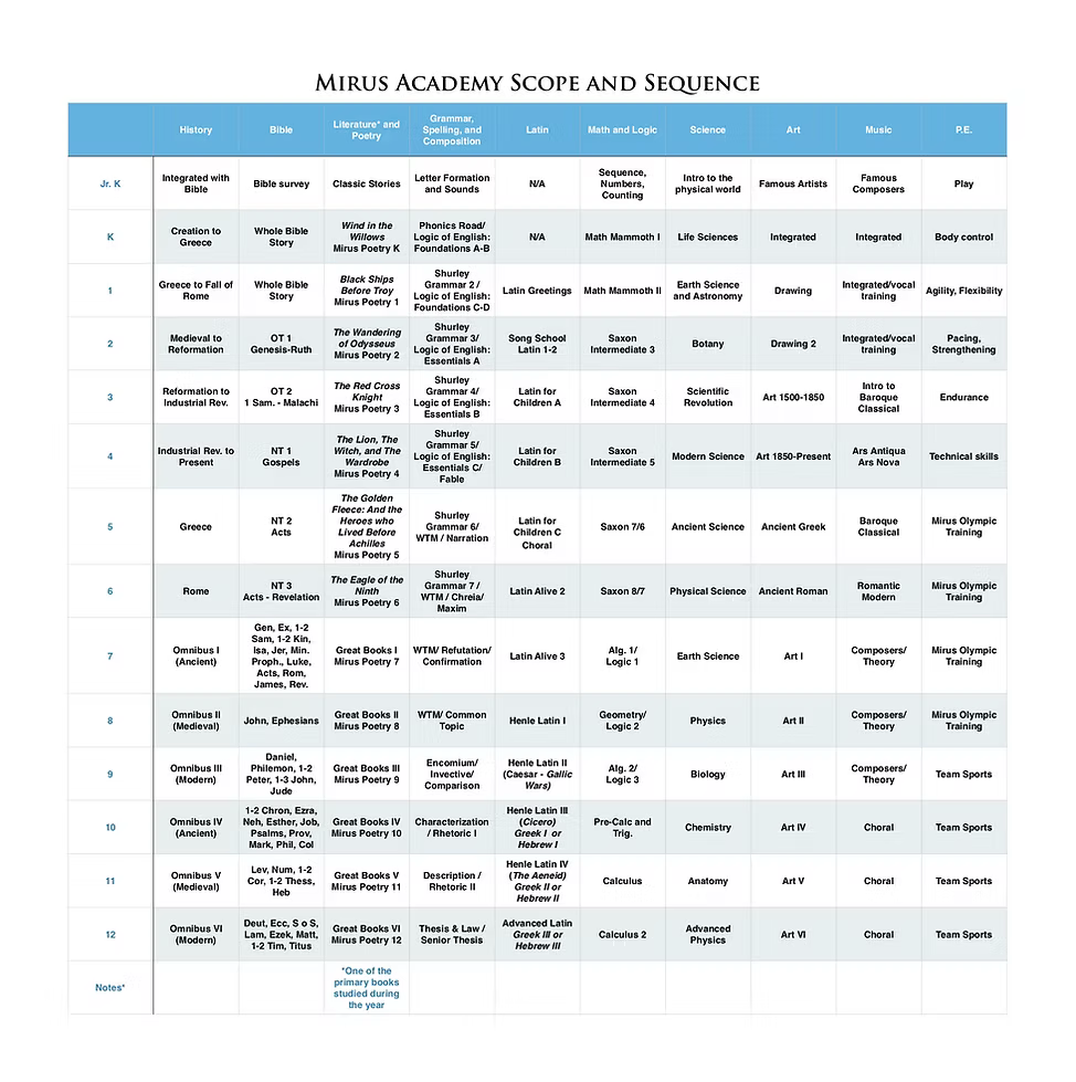 Mirus Academy is a 12-K program that sets its curriculum based on the vision we have for the graduate, thus working from 12 grade backwards to kindergarten. In seeking to mature students, we understand that they must be challenged to go beyond themselves and we have developed a sequence that age-appropriately does this. Our curriculum is not a publishing company or series of textbooks, rather, our curriculum is truly our teachers and the wisdom they bring to the classroom.